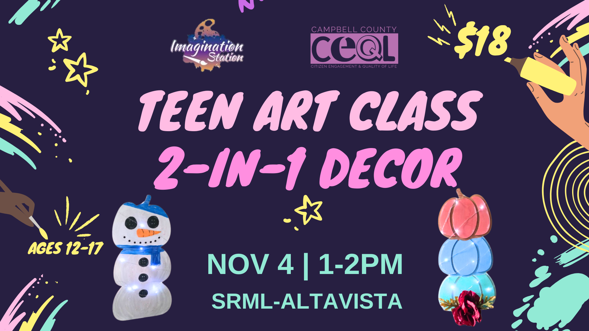 Join us to create a double-sided wood project! We will paint our project and wrap it with lights to make it light up. This art class will be at our Altavista location on Tuesday, Nov. 4, 1 – 2 p.m. For ages 12 – 17. The cost is $18/person. Register online with CivicRec at secure.rec1.com/VA/campbell-county-va/catalog?filter=c2VhcmNoPTM4NzE5Njk=.